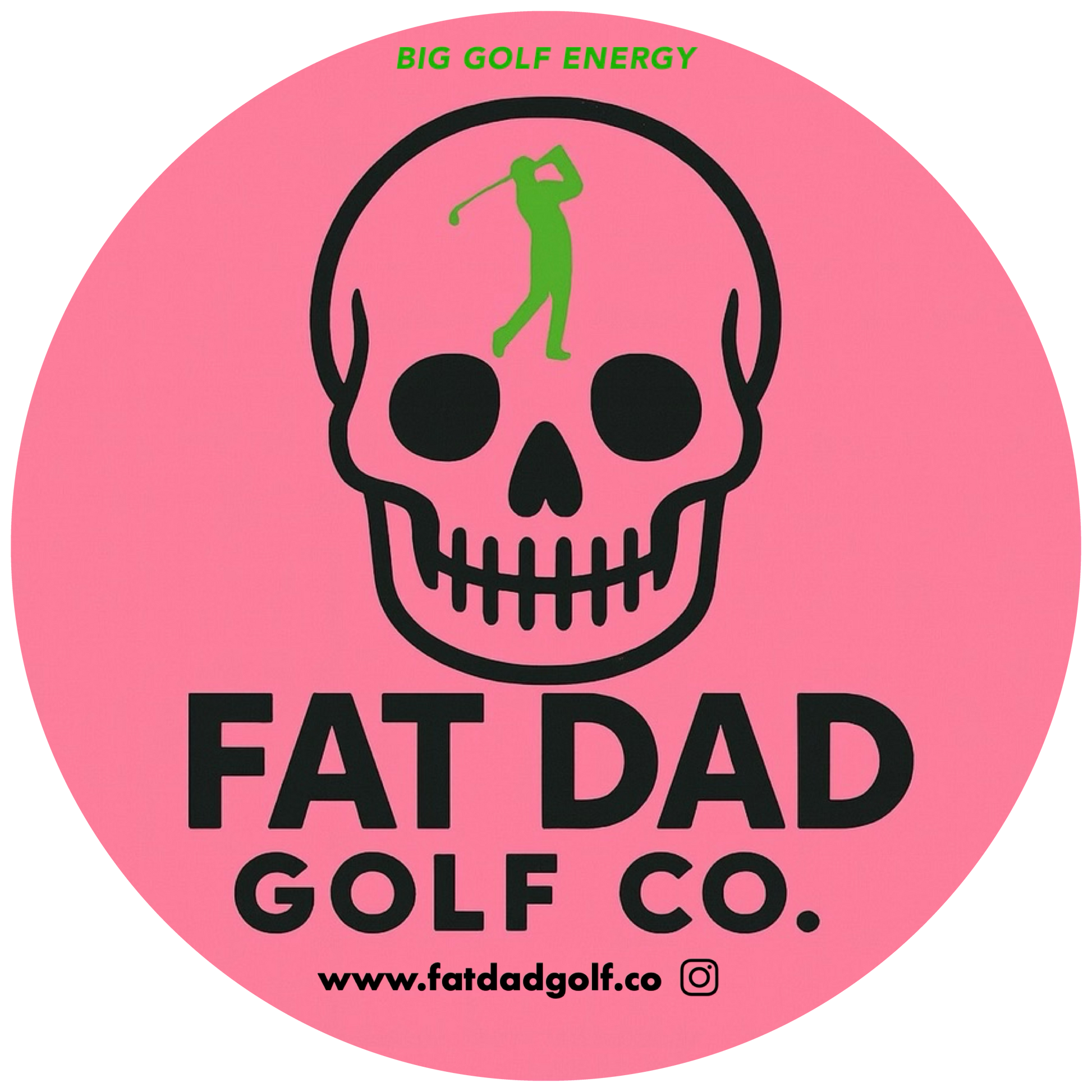 fat dad pink. black skull. neon green golfer living rent-free in your head — this is the official big golf energy badge for carts, coolers, laptops, and locker doors.